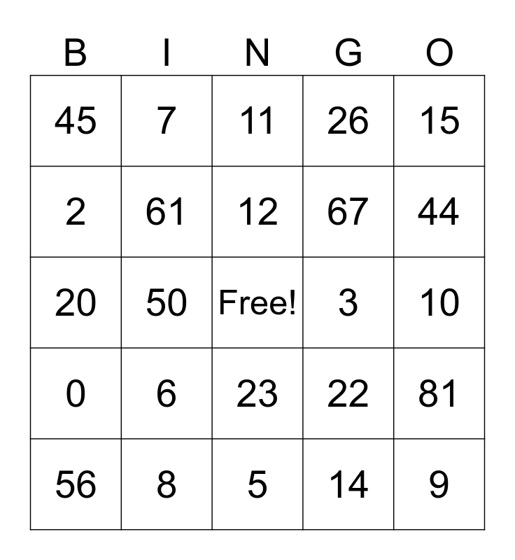 This bingo card has a free space and 24 words: 6, 8, 12, 56, 15, 45, 2, 7, 3, 23, 67, 20, 22, 81, 61, 14, 10, 11, 44, 50, 9, 0, 26 and 5.