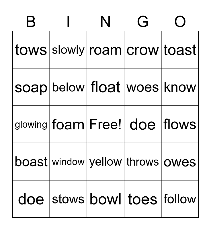 This bingo card has a free space and 24 words: window, stows, float, doe, toast, tows, soap, slowly, doe, yellow, woes, glowing, throws, owes, below, toes, flows, roam, know, foam, follow, boast, crow and bowl.