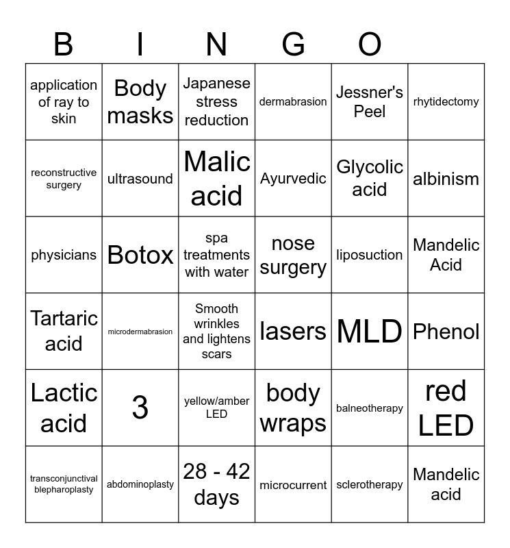 This bingo card has 37 words: balneotherapy, body wraps, sclerotherapy, reconstructive surgery, microdermabrasion, liposuction, ultrasound, microcurrent, Jessner's Peel, transconjunctival blepharoplasty, albinism, dermabrasion, physicians, spa treatments with water, rhytidectomy, nose surgery, 3, Japanese stress reduction, Mandelic Acid, Botox, application of ray to skin, Ayurvedic, Smooth wrinkles and lightens scars, MLD, abdominoplasty, Phenol, Body masks, 28 - 42 days, red LED, yellow/amber LED, blue LED, lasers, Glycolic acid, Lactic acid, Tartaric acid, Malic acid and Mandelic acid.