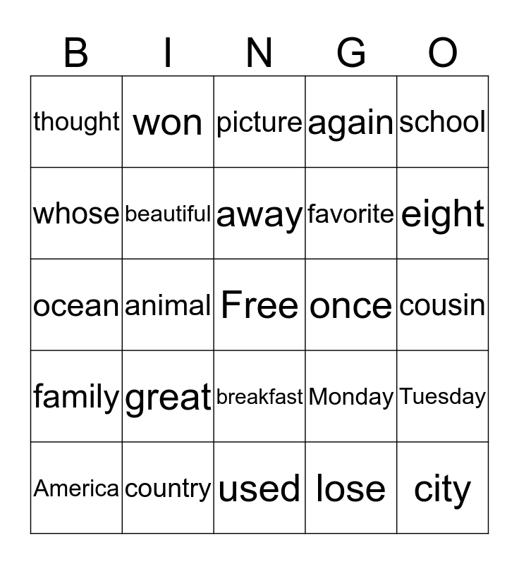This bingo card has a free space and 24 words: great, country, away, America, school, thought, whose, won, once, breakfast, favorite, ocean, Monday, Tuesday, beautiful, lose, cousin, picture, eight, animal, city, family, again and used.