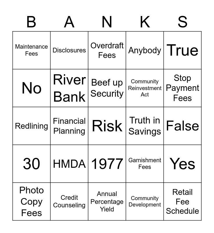 This bingo card has 25 words: HMDA, Annual Percentage Yield, Beef up Security, Photo Copy Fees, True, Maintenance Fees, No, Disclosures, Truth in Savings, 1977, Community Reinvestment Act, Redlining, Garnishment Fees, Yes, River Bank, Retail Fee Schedule, False, Overdraft Fees, Stop Payment Fees, Financial Planning, Risk, Credit Counseling, 30, Anybody and Community Development.