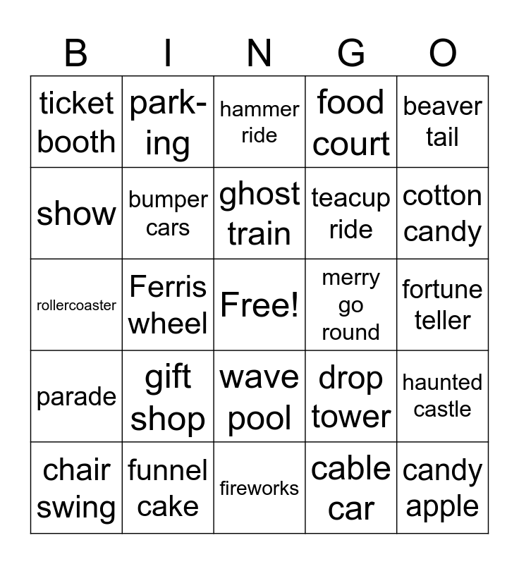 This bingo card has a free space and 29 words: chair swing, slingshot, Ferris wheel, popcorn, ticket booth, hammer ride, bumper cars, gift shop, merry go round, funnel cake, fortune teller, candy apple, fireworks, cable car, cotton candy, French fries, wave pool, parade, beaver tail, rollercoaster, drop tower, log ride, teacup ride, show, food court, park-ing, haunted castle, ghost train and water park.