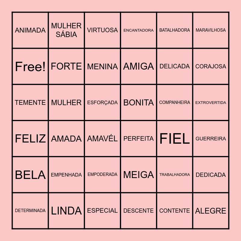 This bingo card has 36 words: FELIZ, AMADA, ESPECIAL, AMIGA, COMPANHEIRA, EXTROVERTIDA, ANIMADA, LINDA, VIRTUOSA, MEIGA, DELICADA, MARAVILHOSA, BELA, MULHER, MENINA, ENCANTADORA, TRABALHADORA, GUERREIRA, Free!, FORTE, AMAVÉL, PERFEITA, FIEL, DEDICADA, TEMENTE, MULHER SÁBIA, ESFORÇADA, DESCENTE, BATALHADORA, CORAJOSA, DETERMINADA, EMPENHADA, EMPODERADA, BONITA, CONTENTE and ALEGRE.