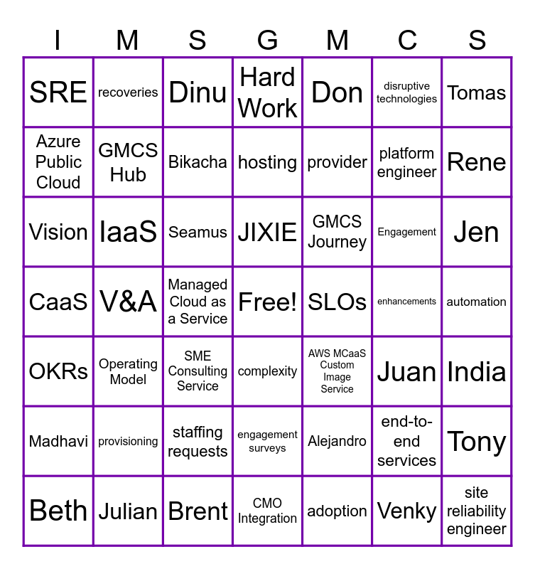 This bingo card has a free space and 105 words: Aidan, Beth, Don, Dave, Conrad, Celebrations, DP-203, AI-900, AZ-400, AZ-900, Hemant, Ranjan, Venky, Sudarsanan, Arun, Madhavi, Dinu, Cheryl, Pilar, Ar-Ar, Satish, Wasi, Julian, Emiliano, Alejandro, Seamus, Bikacha, Hard Work, cornerstone, excellence, GMCS Journey, Managed Cloud as a Service, Roadmap, CMO Integration, SME Consulting Service, AWS MCaaS Custom Image Service, Edge Offering, MCaaS Light Service, Azure Public Cloud, CaaS, PaaS, IaaS, Operating Model, disruptive technologies, end-to-end services, SRE, upskill, platform engineer, a day in the life, site reliability engineer, DevOps, SLOs, automation, kubernetes, linux, architecture, IAM, python, performance, JIXIE, Vision, GMCS Landing Zone, standards, platinum, Song, complexity, demand, recoveries, hosting, provider, V&A, Pipeline, operational excellence, AVD, Jomer, Tony, Lucas, Shirli, Jen, adoption, savings, milestones, Brent, Tomas, John, Rene, Allen, optimization, enhancements, provisioning, Juan, Charmaine, Sandeep, Venkat, Engagement, India, Philippines, Argentina, GMCS Hub, OKRs, training, enablement, staffing requests, engagement surveys and CliftonStrenths Domains.