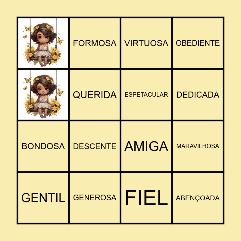 This bingo card has 17 images and 47 words: LINDA, MARAVILHOSA, MEIGA, ABENÇOADA, DETERMINADA, CORAJOSA, VIRTUOSA, MULHER SÁBIA, EMPODERADA, FIEL, TEMENTE, ALEGRE, QUERIDA, AMÁVEL, OBEDIENTE, GENTIL, FORMOSA, BONITA, MARAVILHOSA, DESCENTE, AMADA, ESPETACULAR, LUZ, INTELIGENTE, BELA, SERVA, FILHA, ESPIRUTUAL, MOTIVADORA, CONSELHEIRA, RESILIENTE, GRATA, INTERCESSORA, AMIGA, RESPEITADA, PROATIVA, ENCANTADORA, ESPECIAL, DEDICADA, BONDOSA, GENEROSA, COMPANHEIRA, MENINA, MULHER, DESCENTE, PERFEITA and DELICADA.