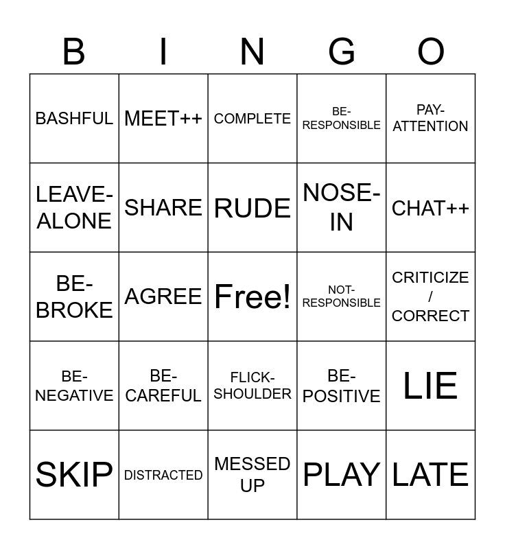 This bingo card has a free space and 45 words: ON-TIME, LATE, GO-TO, SKIP, WORK-char, PLAY, COMPLETE, POSTPONE, PAY-ATTENTION, DISTRACTED, BE-RESPONSIBLE, NOT-RESPONSIBLE, FLICK-SHOULDER, BE-CAREFUL, IN-GEAR (organized), MESSED UP, GOOD MONEY+EXCHANGE, BE-BROKE, TALK++, CHAT++, MEET++, MINGLE, QUIET, BASHFUL, SUPPORT, CRITICIZE / CORRECT, ENCOURAGE, INSULT, BE-POSITIVE, BE-NEGATIVE, BE-HONEST, LIE, STRAIGHT-TALK-TO, VAGUE-TALK-TO, EASY GET ALONG, AGREE, DISAGREE, COMPLAIN, RESPECT-TO, RUDE, LEAVE-ALONE, NOSE-IN, TOUCH (somone’s stuff), SHARE and SELFISH.