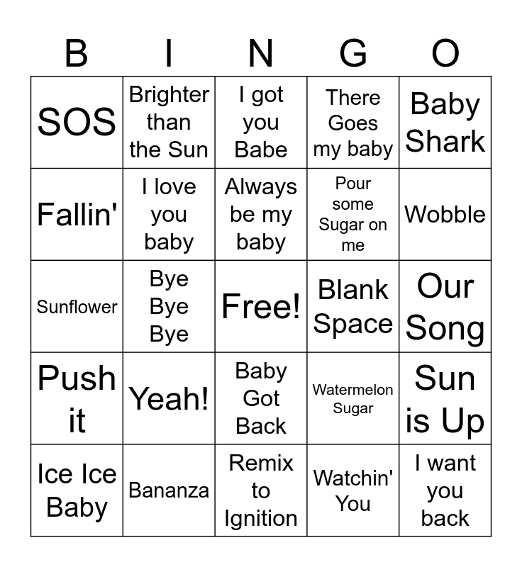 This bingo card has a free space and 39 words: Love on Top, Baby, Hit me Baby one more Time, I love you baby, Ice Ice Baby, Baby Got Back, Always be my baby, Baby come Back, Baby Shark, Push it, Bye Bye Bye, There Goes my baby, I want you back, Our Song, Blank Space, Yeah!, Umbrella, SOS, Down, Watermelon Sugar, Fallin', Remix to Ignition, Pour some Sugar on me, Wobble, Call me Maybe, Whatever you Like, Island in the Sun, Here comes the Sun, When the Sun goes down, Brighter than the Sun, Sun Daze, Sunroof, I got you Babe, Bananza, Watchin' You, Hey Baby, Sun is Up, Sunflower and Baby I'm Yours.