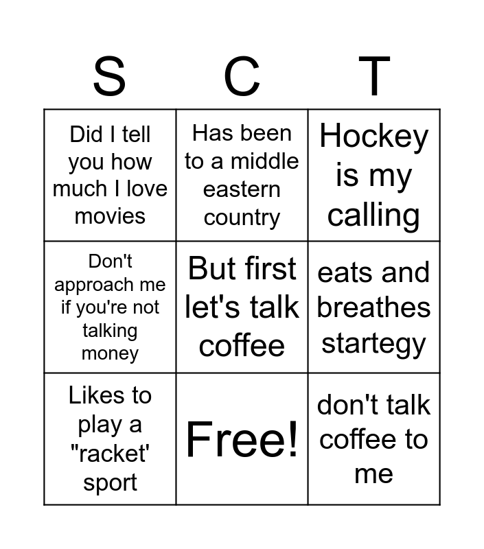 This bingo card has 10 words: Free!, Hockey is my calling, Did I tell you how much I love movies, But first let's talk coffee, Don't approach me if you're not talking money, Likes to play a "racket' sport, Has been to a middle eastern country, Excel and I are best friends, eats and breathes startegy and don't talk coffee to me.