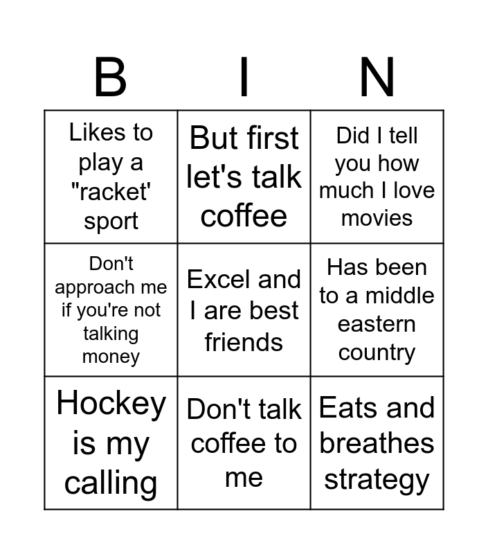 This bingo card has 9 words: Hockey is my calling, Did I tell you how much I love movies, But first let's talk coffee, Don't approach me if you're not talking money, Likes to play a "racket' sport, Has been to a middle eastern country, Excel and I are best friends, Eats and breathes strategy and Don't talk coffee to me.