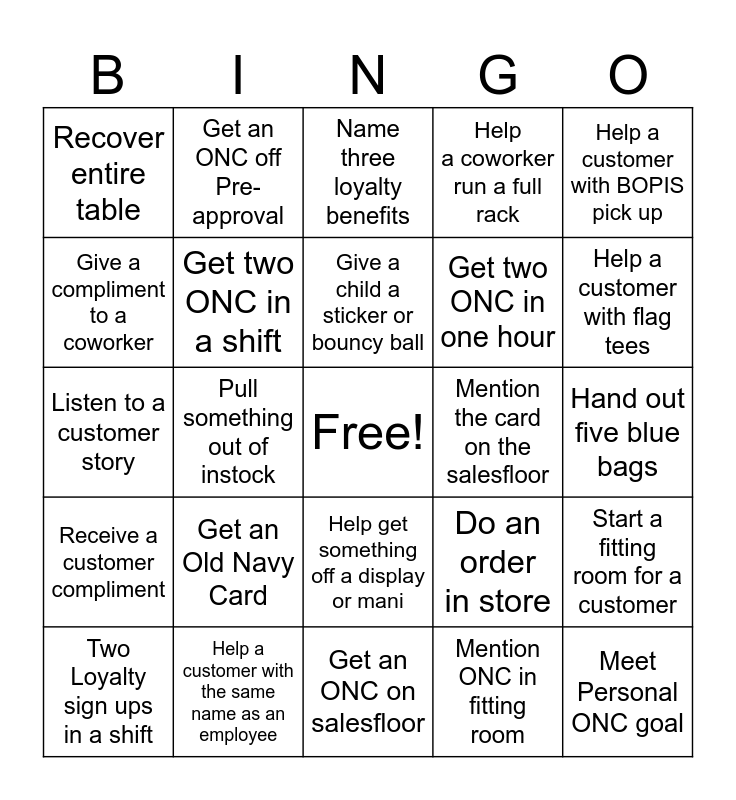 This bingo card has a free space and 24 words: Get an Old Navy Card, Help a customer with the same name as an employee, Give a child a sticker or bouncy ball, Two Loyalty sign ups in a shift, Help a customer with BOPIS pick up, Recover entire table, Give a compliment to a coworker, Get an ONC off Pre-approval, Mention the card on the salesfloor, Help get something off a display or mani, Get two ONC in one hour, Listen to a customer story, Do an order in store, Start a fitting room for a customer, Get two ONC in a shift, Mention ONC in fitting room, Hand out five blue bags, Name three loyalty benefits, Help a customer with flag tees, Pull something out of instock, Meet Personal ONC goal, Receive a customer compliment, Help a coworker run a full rack and Get an ONC on salesfloor.