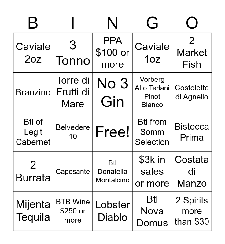 This bingo card has a free space and 24 words: Capesante, BTB Wine $250 or more, No 3 Gin, Mijenta Tequila, 2 Market Fish, Caviale 2oz, Branzino, 3 Tonno, Btl from Somm Selection, Btl Donatella Montalcino, Vorberg Alto Terlani Pinot Bianco, Btl of Legit Cabernet, $3k in sales or more, Costata di Manzo, Torre di Frutti di Mare, Btl Nova Domus, Bistecca Prima, PPA $100 or more, Costolette di Agnello, Belvedere 10, 2 Spirits more than $30, 2 Burrata, Caviale 1oz and Lobster Diablo.