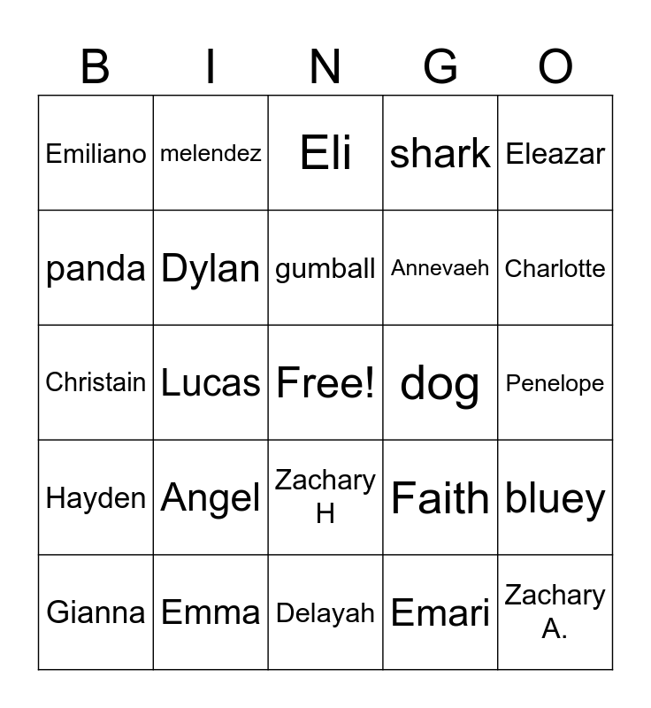 This bingo card has a free space and 29 words: Gianna, Pig, Lucas, Jack, Emiliano, Eli, Dylan, Angel, dog, Emma, Penelope, Zachary A., Delayah, Emari, Charlotte, Alexa, Zachary H, Hayden, Eleazar, Christain, Faith, Jadyn, Annevaeh, panda, shark, melendez, bluey, gumball and spongebob.