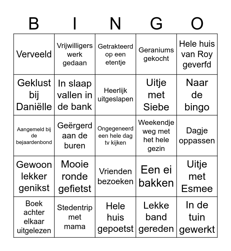 This bingo card has 25 words: Mooie ronde gefietst, Hele huis gepoetst, Heerlijk uitgeslapen, Boek achter elkaar uitgelezen, Hele huis van Roy geverfd, Verveeld, Geklust bij Daniëlle, Vrijwilligers werk gedaan, Weekendje weg met het hele gezin, Vrienden bezoeken, Uitje met Siebe, Aangemeld bij de bejaardenbond, Een ei bakken, Uitje met Esmee, In slaap vallen in de bank, In de tuin gewerkt, Dagje oppassen, Getrakteerd op een etentje, Naar de bingo, Geërgerd aan de buren, Ongegeneerd een hele dag tv kijken, Stedentrip met mama, Gewoon lekker genikst, Geraniums gekocht and Lekke band gereden.