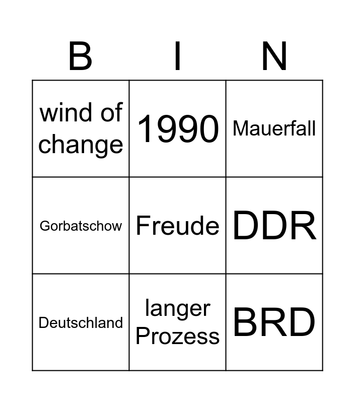 This bingo card has a free space and 8 words: DDR, Mauerfall, 1990, Deutschland, wind of change, BRD, Gorbatschow and langer Prozess.