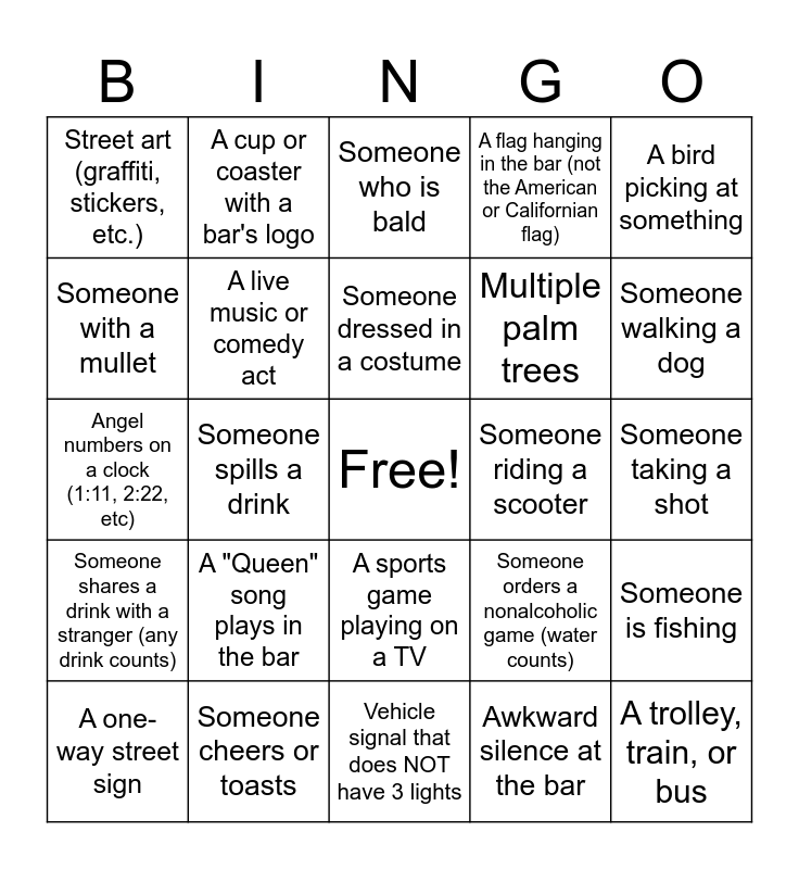 This bingo card has a free space and 24 words: A "Queen" song plays in the bar, Someone cheers or toasts, Someone dressed in a costume, A one-way street sign, A bird picking at something, Street art (graffiti, stickers, etc.), Someone with a mullet, A cup or coaster with a bar's logo, Someone riding a scooter, A sports game playing on a TV, Multiple palm trees, Angel numbers on a clock (1:11, 2:22, etc), Someone orders a nonalcoholic game (water counts), Someone is fishing, A live music or comedy act, Awkward silence at the bar, Someone taking a shot, Someone who is bald, Someone walking a dog, Someone spills a drink, A trolley, train, or bus, Someone shares a drink with a stranger (any drink counts), A flag hanging in the bar (not the American or Californian flag) and Vehicle signal that does NOT have 3 lights.