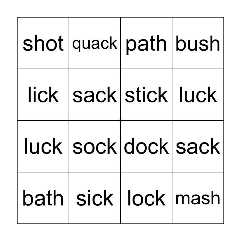 This bingo card has 26 words: lock, dash, luck, dock, lick, shot, sack, quack, lock, dash, luck, dock, lick, shot, sack, quack, bush, mash, path, bath, sock, dish, sick, math, stick and shut.