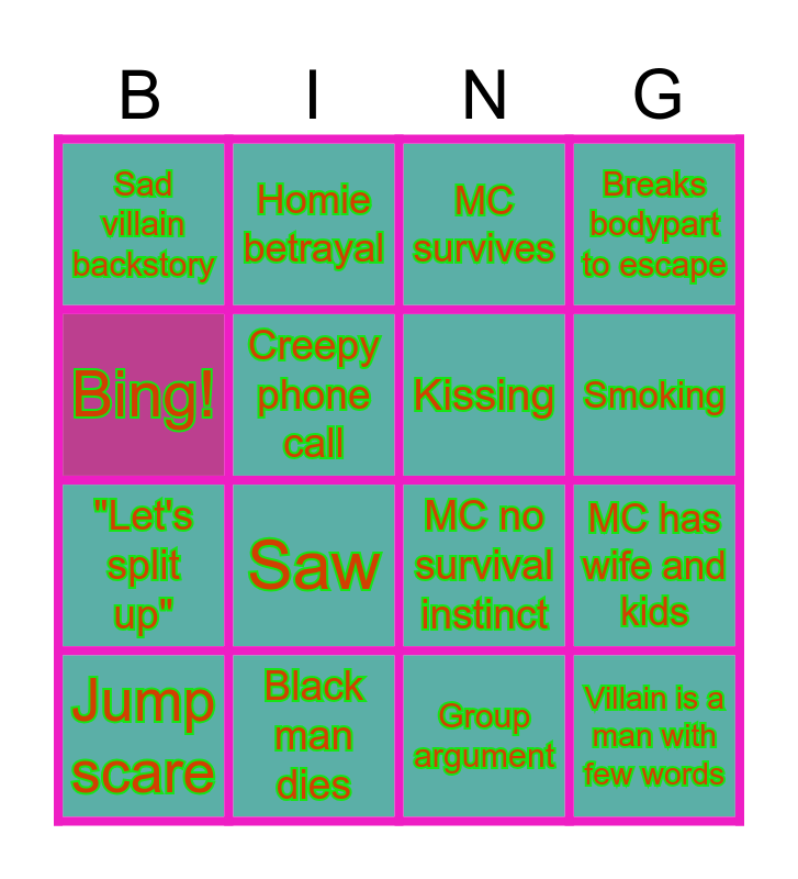 This bingo card has 16 words: Black man dies, MC has wife and kids, MC survives, Sad villain backstory, "Let's split up", Homie betrayal, MC no survival instinct, Group argument, Bing!, Creepy phone call, Jump scare, Breaks bodypart to escape, Saw, Smoking, Kissing and Villain is a man with few words.