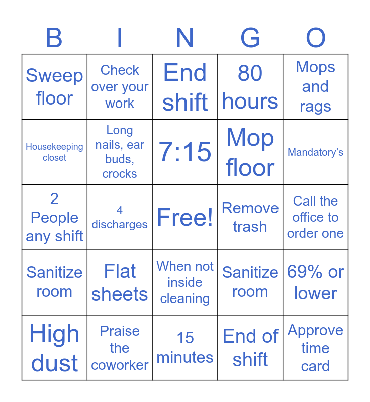This bingo card has a free space and 24 words: High dust, Flat sheets, 7:15, End of shift, Mops and rags, Sweep floor, Check over your work, End shift, Remove trash, Call the office to order one, 2 People any shift, Long nails, ear buds, crocks, Sanitize room, 69% or lower, Housekeeping closet, Praise the coworker, 15 minutes, 80 hours, Mandatory’s, Sanitize room, 4 discharges, When not inside cleaning, Mop floor and Approve time card.
