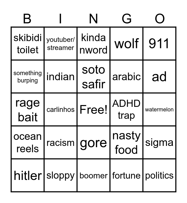 This bingo card has a free space and 24 words: racism, sloppy, soto safir, hitler, 911, skibidi toilet, something burping, youtuber/ streamer, ADHD trap, gore, arabic, rage bait, nasty food, sigma, indian, fortune, watermelon, kinda nword, ad, carlinhos, politics, ocean reels, wolf and boomer.