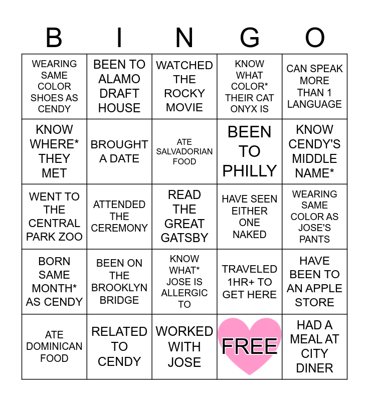 This bingo card has 1 images and 30 words: RELATED TO CENDY, ATTENDED A NYC COMIC CON, ATTENDED THE CEREMONY, WENT TO THE BRONX ZOO, WEARING SAME COLOR SHOES AS CENDY, WATCHED THE ROCKY MOVIE, BROUGHT A DATE, KNOW WHAT* JOSE IS ALLERGIC TO, HAVE SEEN EITHER ONE NAKED, WORKED WITH JOSE, WEARING SAME COLOR AS JOSE'S PANTS, READ THE GREAT GATSBY, FREE, HAD A MEAL AT CITY DINER, KNOW CENDY'S MIDDLE NAME*, KNOW WHAT BEVERAGE* CENDY CANNOT DRINK, TRAVELED 1HR+ TO GET HERE, BORN SAME MONTH* AS CENDY, BEEN ON THE BROOKLYN BRIDGE, CAN SPEAK MORE THAN 1 LANGUAGE, WENT TO THE CENTRAL PARK ZOO, KNOW JOSE'S MIDDLE NAME*, BEEN TO ALAMO DRAFT HOUSE, BEEN TO PHILLY, KNOW WHERE* THEY MET, KNOW WHAT COLOR* THEIR CAT ONYX IS, HAVE BEEN TO AN APPLE STORE, ATE DOMINICAN FOOD, ATE SALVADORIAN FOOD and MET THE PARENTS.