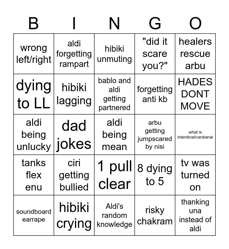 This bingo card has a free space and 24 words: ciri getting bullied, hibiki crying, bablo and aldi getting partnered, soundboard earrape, healers rescue arbu, wrong left/right, dying to LL, aldi forgetting rampart, arbu getting jumpscared by nisi, 1 pull clear, forgetting anti kb, aldi being unlucky, 8 dying to 5, tv was turned on, hibiki lagging, risky chakram, what is interdinal/cardianal, hibiki unmuting, HADES DONT MOVE, dad jokes, thanking una instead of aldi, tanks flex enu, "did it scare you?" and Aldi's random knowledge.