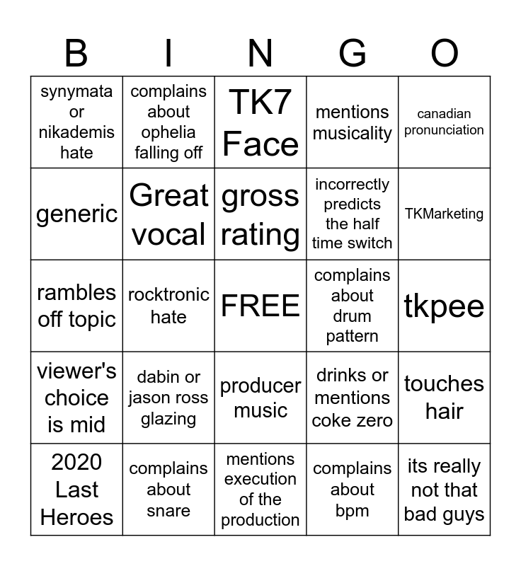 This bingo card has a free space and 24 words: dabin or jason ross glazing, complains about snare, gross rating, 2020 Last Heroes, canadian pronunciation, synymata or nikademis hate, generic, complains about ophelia falling off, complains about drum pattern, producer music, incorrectly predicts the half time switch, rambles off topic, drinks or mentions coke zero, touches hair, Great vocal, complains about bpm, tkpee, TK7 Face, TKMarketing, rocktronic hate, its really not that bad guys, viewer's choice is mid, mentions musicality and mentions execution of the production.
