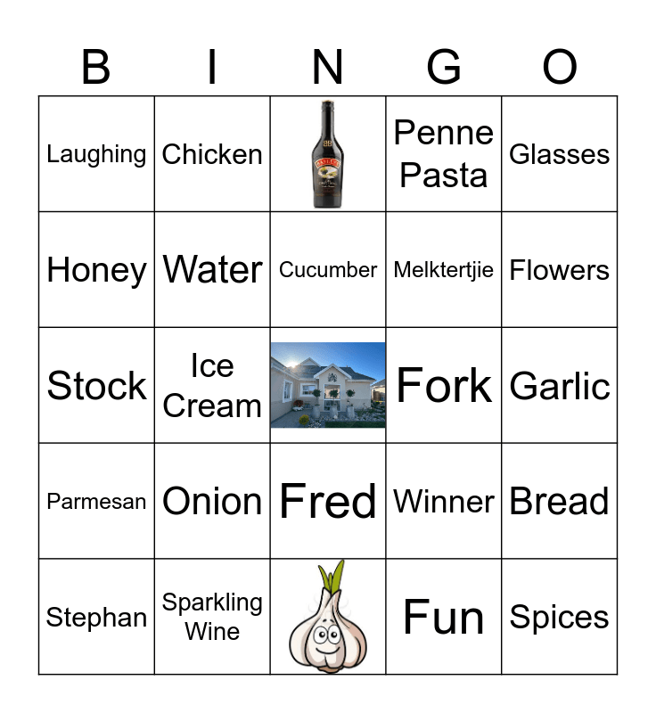 This bingo card has 16 images, a free space and 49 words: Amanda, Avocado, Basil, Bread, Cake, Candles, Chicken, Chips, Cucumber, Dried Tomatoes, Fred, Walk, Garlic, Glasses, Hennie, Honey, Ice Cream, Laughing, Lynette, Melktertjie, Onion, Parmesan, Penne Pasta, Prize, Red Wine, Salad, Sanet, Serviette, Spices, Spinach, Stephan, Tomatoes, Food, White Wine, Winner, Sparkling Wine, Cream, Stock, Fun, Onion Powder, Water, Knife, Fork, Spoon, Napkins, Plants, Flowers, Dishes and Chairs.
