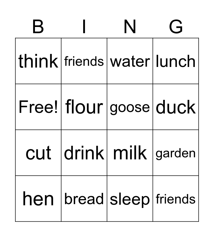 This bingo card has 16 words: bread, garden, water, think, cut, friends, milk, sleep, Free!, flour, hen, lunch, drink, duck, goose and friends.