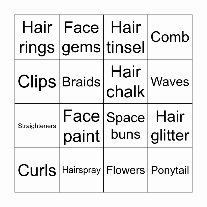 This bingo card has 16 words: Curls, Hairspray, Hair tinsel, Comb, Clips, Face gems, Space buns, Hair glitter, Hair rings, Braids, Flowers, Waves, Straighteners, Face paint, Hair chalk and Ponytail.