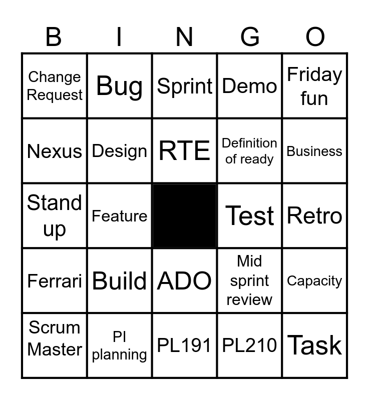 This bingo card has a free space and 29 words: Scrum Master, PBI, Feature, Product Owner, Change Request, Sprint, Design, Build, Test, PI planning, Retro, Task, PL191, PL210, Business, Design Assurance, ADO, Ferrari, Friday fun, Stand up, Mid sprint review, Definition of done, Definition of ready, Nexus, Demo, Bug, Capacity, RTE and Agile.