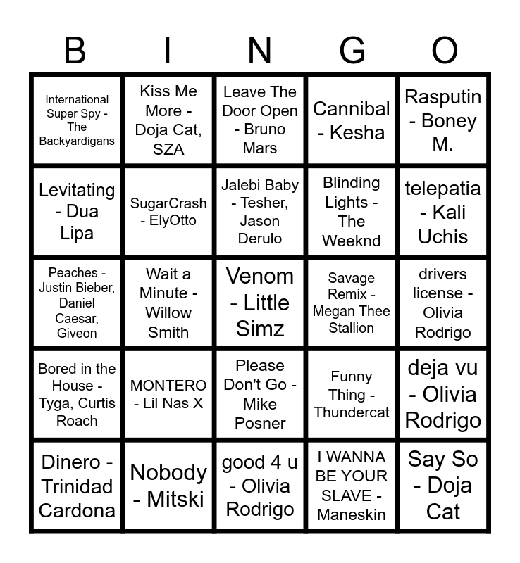 This bingo card has 25 words: MONTERO - Lil Nas X, good 4 u - Olivia Rodrigo, Jalebi Baby - Tesher, Jason Derulo, Dinero - Trinidad Cardona, Rasputin - Boney M., International Super Spy - The Backyardigans, Levitating - Dua Lipa, Kiss Me More - Doja Cat, SZA, Savage Remix - Megan Thee Stallion, Please Don't Go - Mike Posner, Blinding Lights - The Weeknd, Peaches - Justin Bieber, Daniel Caesar, Giveon, Funny Thing - Thundercat, deja vu - Olivia Rodrigo, SugarCrash - ElyOtto, Say So - Doja Cat, drivers license - Olivia Rodrigo, Leave The Door Open - Bruno Mars, telepatia - Kali Uchis, Wait a Minute - Willow Smith, Venom - Little Simz, Nobody - Mitski, Bored in the House - Tyga, Curtis Roach, Cannibal - Kesha and I WANNA BE YOUR SLAVE - Maneskin.