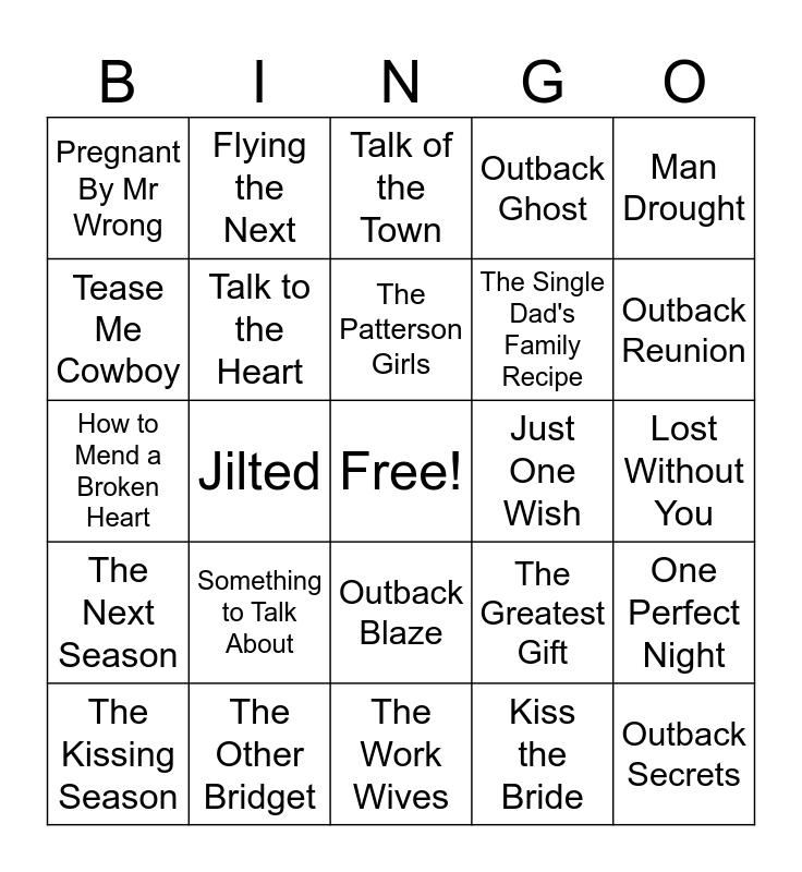This bingo card has a free space and 33 words: Outback Dreams, The Road To Hope, Jilted, The Bad Bridesmaid, The Next Season, Talk to the Heart, Man Drought, The Kissing Season, Flying the Next, A Dog and a Diamond, The Patterson Girls, Talk of the Town, Outback Sisters, The Art of Keeping Secrets, Just One Wish, Outback Reunion, The Other Bridget, How to Mend a Broken Heart, Something to Talk About, The Greatest Gift, Outback Blaze, Fire Me Up, Pregnant By Mr Wrong, Lost Without You, The Work Wives, Outback Secrets, Outback Ghost, The Single Dad's Family Recipe, Tease Me Cowboy, One Perfect Night, Stand In Star, Kiss the Bride and Casey.