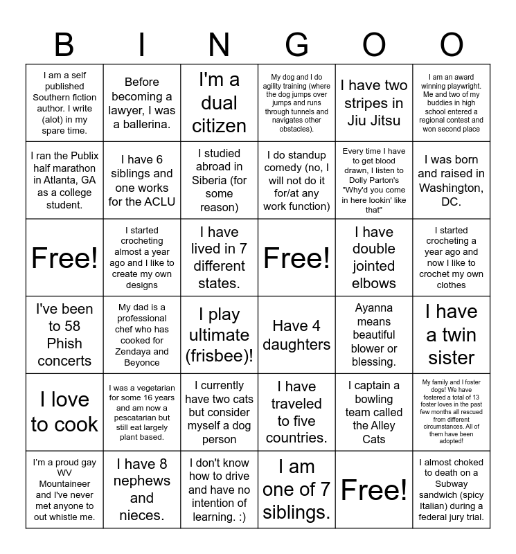 This bingo card has 36 words: I have traveled to five countries., I currently have two cats but consider myself a dog person, I am one of 7 siblings., I ran the Publix half marathon in Atlanta, GA as a college student., I've been to 58 Phish concerts, Free!, I have 6 siblings and one works for the ACLU, I don't know how to drive and have no intention of learning. :), I have two stripes in Jiu Jitsu, I captain a bowling team called the Alley Cats, I was born and raised in Washington, DC., My dog and I do agility training (where the dog jumps over jumps and runs through tunnels and navigates other obstacles)., My family and I foster dogs! We have fostered a total of 13 foster loves in the past few months all rescued from different circumstances. All of them have been adopted!, I started crocheting almost a year ago and I like to create my own designs, I do standup comedy (no, I will not do it for/at any work function), I am a self published Southern fiction author. I write (alot) in my spare time., I love to cook, I have double jointed elbows, Free!, I'm a dual citizen, I have lived in 7 different states., My dad is a professional chef who has cooked for Zendaya and Beyonce, Have 4 daughters, I play ultimate (frisbee)!, Ayanna means beautiful blower or blessing., Before becoming a lawyer, I was a ballerina., Every time I have to get blood drawn, I listen to Dolly Parton's "Why'd you come in here lookin' like that", I have 8 nephews and nieces., I studied abroad in Siberia (for some reason), I am an award winning playwright. Me and two of my buddies in high school entered a regional contest and won second place, I almost choked to death on a Subway sandwich (spicy Italian) during a federal jury trial., I’m a proud gay WV Mountaineer and I've never met anyone to out whistle me., I have a twin sister, I started crocheting a year ago and now I like to crochet my own clothes, I was a vegetarian for some 16 years and am now a pescatarian but still eat largely plant based. and Free!.