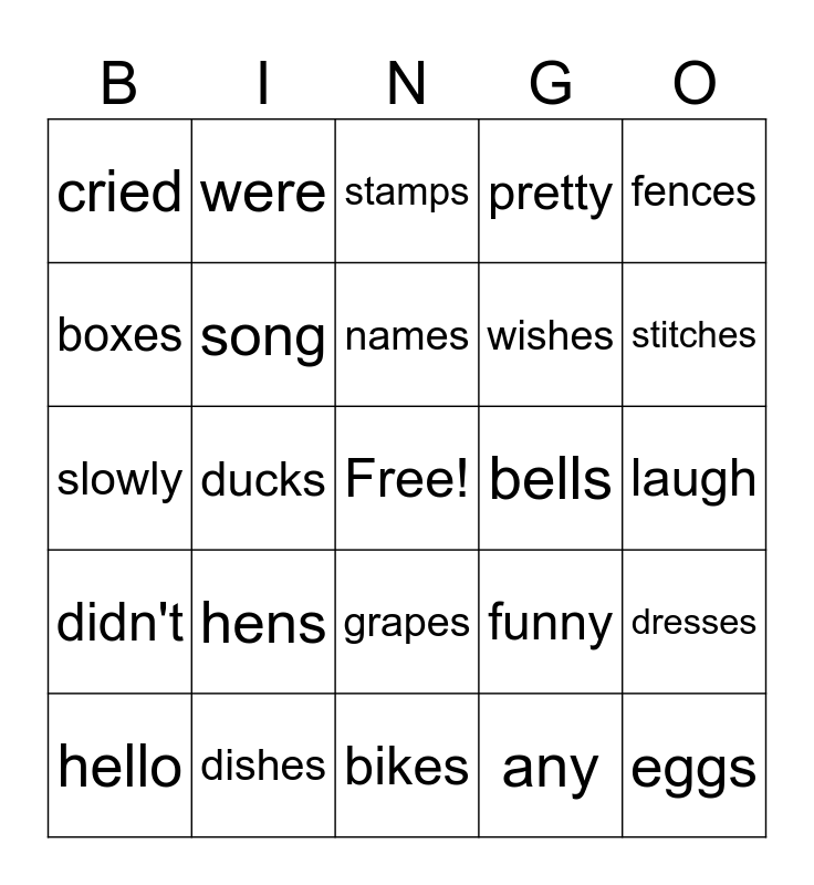 This bingo card has a free space and 24 words: hens, dishes, names, hello, fences, cried, boxes, were, bells, grapes, wishes, slowly, funny, dresses, song, any, laugh, stamps, stitches, ducks, eggs, didn't, pretty and bikes.