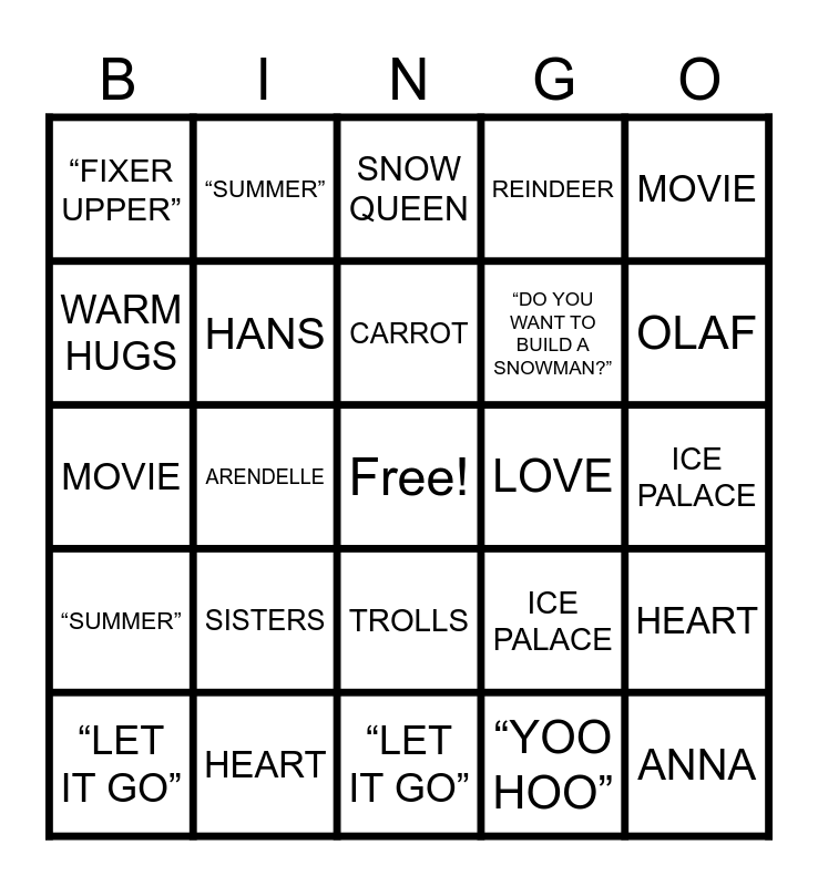 This bingo card has a free space and 47 words: [10:00 AM, 5/24/2024] Shalu: ELSA, ANNA, OLAF, “LET IT GO”, SISTERS, TROLLS, “SUMMER”, SNOWFLAKE, WARM HUGS, MARSHMALLOW, HANS, REINDEER, HEART, ICE PALACE, COLD, PRINCESS, CARROT, LOVE, SNOW QUEEN, MOVIE, ARENDELLE, “YOO HOO”, “FIXER UPPER”, “DO YOU WANT TO BUILD A SNOWMAN?”, ANNA, OLAF, “LET IT GO”, SISTERS, TROLLS, “SUMMER”, SNOWFLAKE, WARM HUGS, MARSHMALLOW, HANS, REINDEER, HEART, ICE PALACE, COLD, PRINCESS, CARROT, LOVE, SNOW QUEEN, MOVIE, ARENDELLE, “YOO HOO”, “FIXER UPPER” and “DO YOU WANT TO BUILD A SNOWMAN?”.