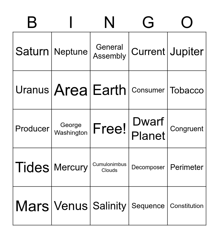This bingo card has a free space and 24 words: Mercury, Venus, Earth, Mars, Jupiter, Saturn, Uranus, Neptune, Dwarf Planet, Cumulonimbus Clouds, Consumer, Producer, Decomposer, Perimeter, Area, Sequence, Congruent, General Assembly, Tobacco, George Washington, Constitution, Tides, Current and Salinity.