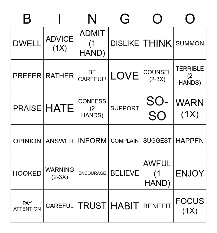 This bingo card has 36 words: BELIEVE, ENCOURAGE, HABIT, PREFER, OPINION, SUPPORT, RATHER, TRUST, THINK, AWFUL (1 HAND), TERRIBLE (2 HANDS), DISLIKE, ENJOY, HATE, LOVE, DWELL, HOOKED, SO-SO, PRAISE, ADMIT (1 HAND), CONFESS (2 HANDS), ANSWER, COMPLAIN, INFORM, SUGGEST, ADVICE (1X), COUNSEL (2-3X), CAREFUL, BE CAREFUL!, SUMMON, FOCUS (1X), PAY ATTENTION, HAPPEN, WARN (1X), WARNING (2-3X) and BENEFIT.