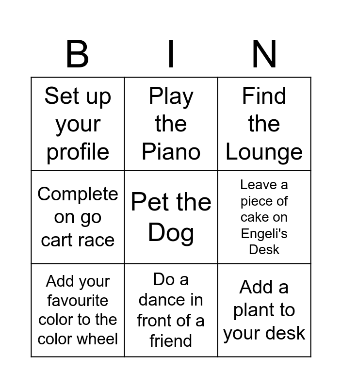 This bingo card has a free space and 8 words: Leave a piece of cake on Engeli's Desk, Find the Lounge, Play the Piano, Add your favourite color to the color wheel, Set up your profile, Add a plant to your desk, Complete on go cart race and Do a dance in front of a friend.