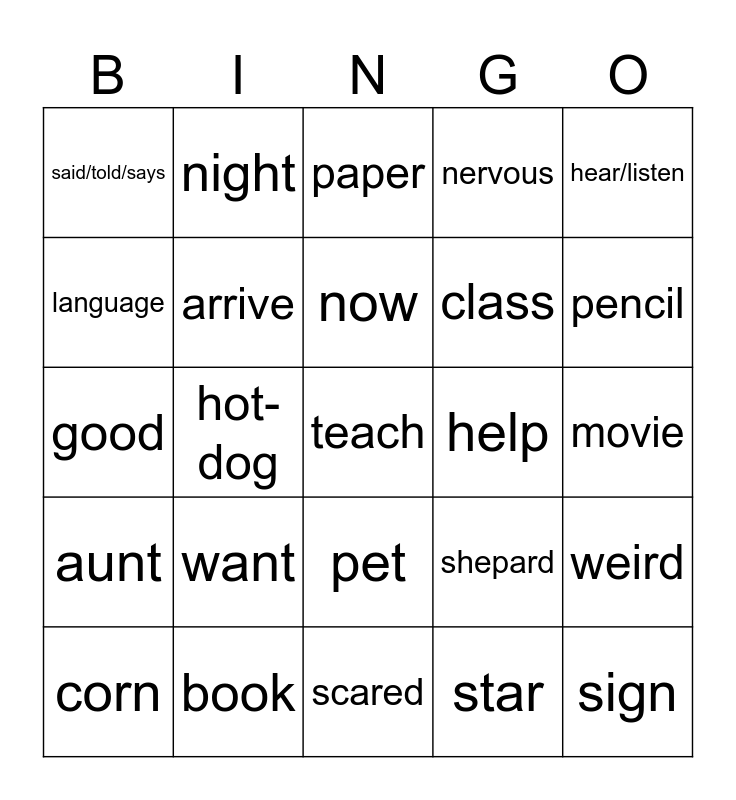 This bingo card has a free space and 113 words: cookie, like (enjoy), science, game, pen, September, nervous, shy, dance, bad, easy, hearing, time, start, ready, sister, pet, cat, lamb, bring, corn, paper, tomorrow, cousin, math, aunt, book, what, book, thirsty, pencil, now, hot-dog, sick, ice cream, friend, study, know, mad, funny, see, year, don't-mind, family, learn, homework, star, language, uncle, home, where, help, child, finish, teacher, go-to, feel, tortilla, water, dad, weird, difficult, dog, past, big, little, student, arrive, good, yesterday, movie, month, live, sushi, candy, sign, want, said/told/says, deaf, confusing, grandma, night, grandpa, shepard, class, silver, tired, hungry, hamburger, boy, mom, surprise, hear/listen, October, brother, sorry, kite, have, apple, test, take/taking, excited, January, sad, song, gold, scared, late, coffee, sleep, why, girl and happy.
