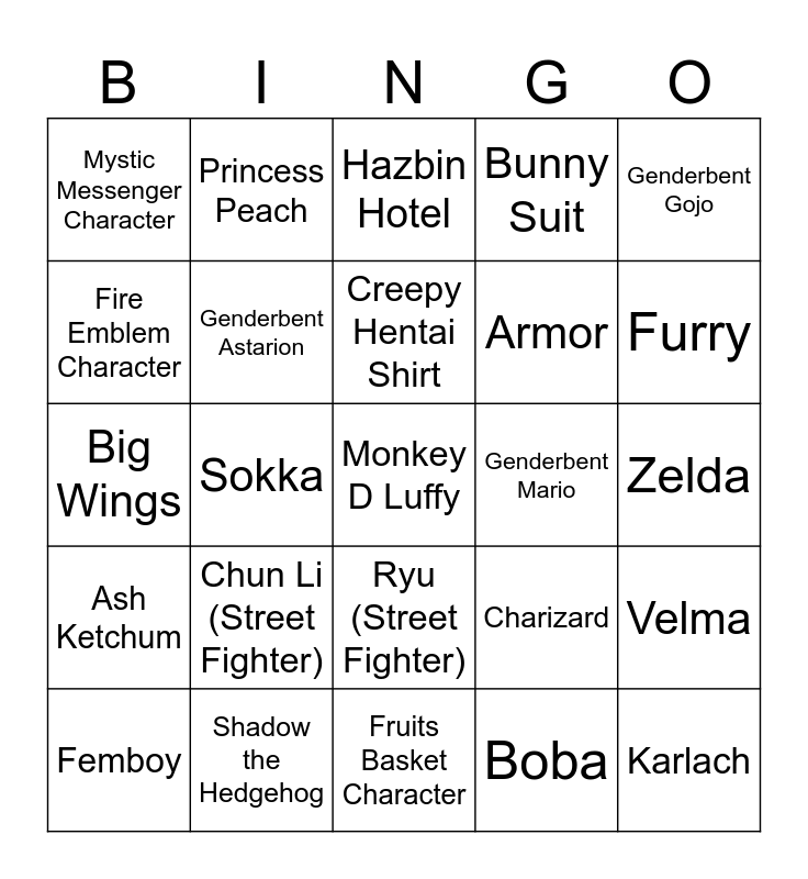 This bingo card has a free space and 24 words: Femboy, Chun Li (Street Fighter), Creepy Hentai Shirt, Boba, Genderbent Gojo, Mystic Messenger Character, Princess Peach, Hazbin Hotel, Genderbent Mario, Zelda, Big Wings, Genderbent Astarion, Charizard, Velma, Fire Emblem Character, Shadow the Hedgehog, Fruits Basket Character, Bunny Suit, Furry, Ash Ketchum, Sokka, Ryu (Street Fighter), Armor and Karlach.