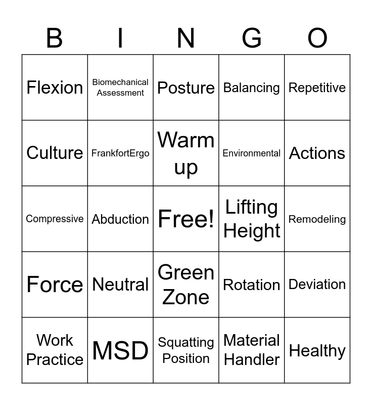 This bingo card has a free space and 24 words: Neutral, MSD, Warm up, Work Practice, Repetitive, Flexion, Culture, Biomechanical Assessment, Lifting Height, Green Zone, Environmental, Compressive, Rotation, Deviation, FrankfortErgo, Material Handler, Remodeling, Posture, Actions, Abduction, Healthy, Force, Balancing and Squatting Position.