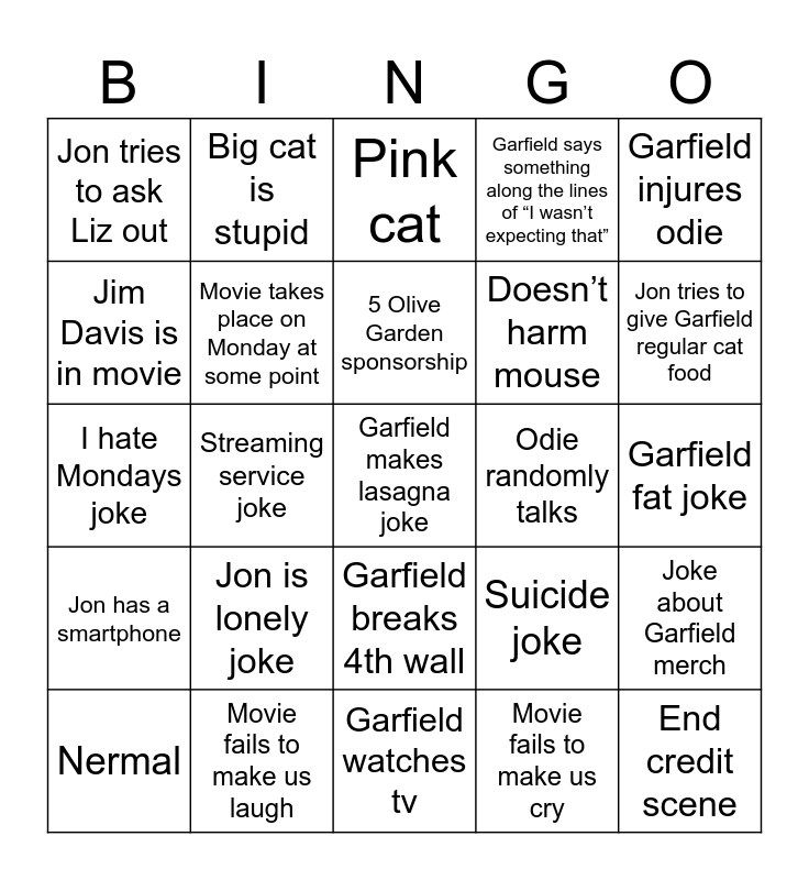 This bingo card has a free space and 24 words: Nermal, Jon is lonely joke, 5 Olive Garden sponsorship, Movie fails to make us cry, Garfield injures odie, Jon tries to ask Liz out, Big cat is stupid, Pink cat, Odie randomly talks, Garfield fat joke, I hate Mondays joke, Movie takes place on Monday at some point, Suicide joke, Joke about Garfield merch, Jim Davis is in movie, Movie fails to make us laugh, Garfield watches tv, Garfield says something along the lines of “I wasn’t expecting that”, Jon tries to give Garfield regular cat food, Jon has a smartphone, Streaming service joke, Garfield breaks 4th wall, Doesn’t harm mouse and End credit scene.