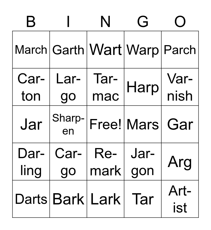 This bingo card has a free space and 24 words: Car-go, Bark, Tar-mac, Darts, Parch, March, Car-ton, Garth, Mars, Re-mark, Harp, Jar, Jar-gon, Arg, Lar-go, Tar, Gar, Wart, Var-nish, Sharp-en, Art-ist, Dar-ling, Warp and Lark.