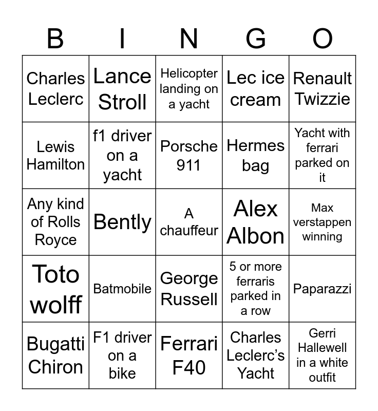 This bingo card has 25 words: Batmobile, Ferrari F40, Porsche 911, Bugatti Chiron, Renault Twizzie, Charles Leclerc, Lewis Hamilton, Lance Stroll, Alex Albon, George Russell, Hermes bag, Any kind of Rolls Royce, 5 or more ferraris parked in a row, Paparazzi, f1 driver on a yacht, Gerri Hallewell in a white outfit, Max verstappen winning, Helicopter landing on a yacht, Yacht with ferrari parked on it, Bently, A chauffeur, F1 driver on a bike, Toto wolff, Lec ice cream and Charles Leclerc’s Yacht.