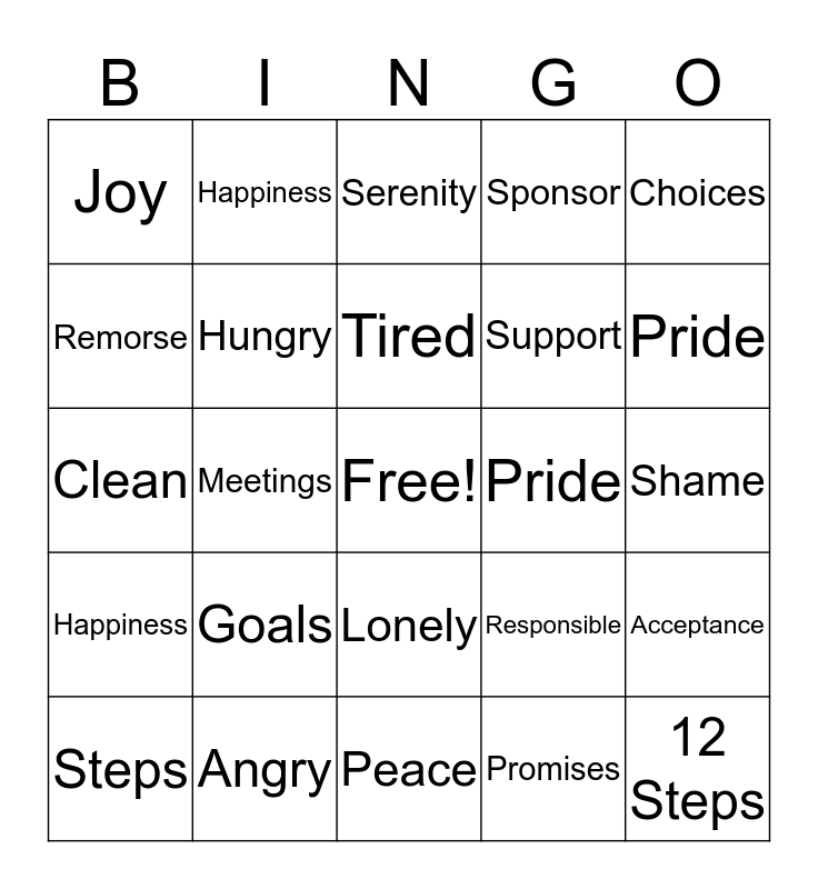 ⚠ This card has duplicate items: Sobriety (2), Hungry (2), Freedom (2), Happiness (2), Pride (2), Peace (2)