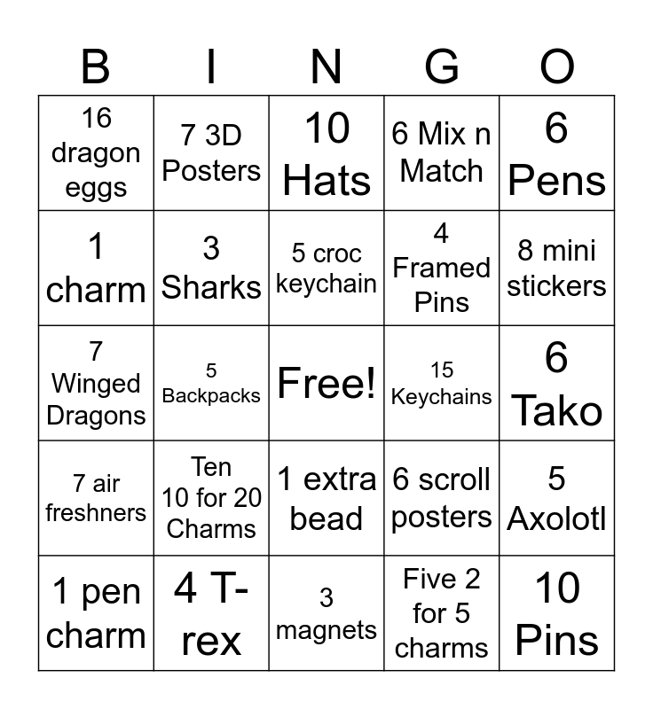 This bingo card has a free space and 24 words: Ten 10 for 20 Charms, 4 T-rex, 5 croc keychain, 1 pen charm, 6 Pens, 16 dragon eggs, 1 charm, 7 3D Posters, 15 Keychains, 1 extra bead, 4 Framed Pins, 7 Winged Dragons, 6 scroll posters, 5 Axolotl, 3 Sharks, Five 2 for 5 charms, 6 Tako, 10 Hats, 8 mini stickers, 5 Backpacks, 10 Pins, 7 air freshners, 6 Mix n Match and 3 magnets.