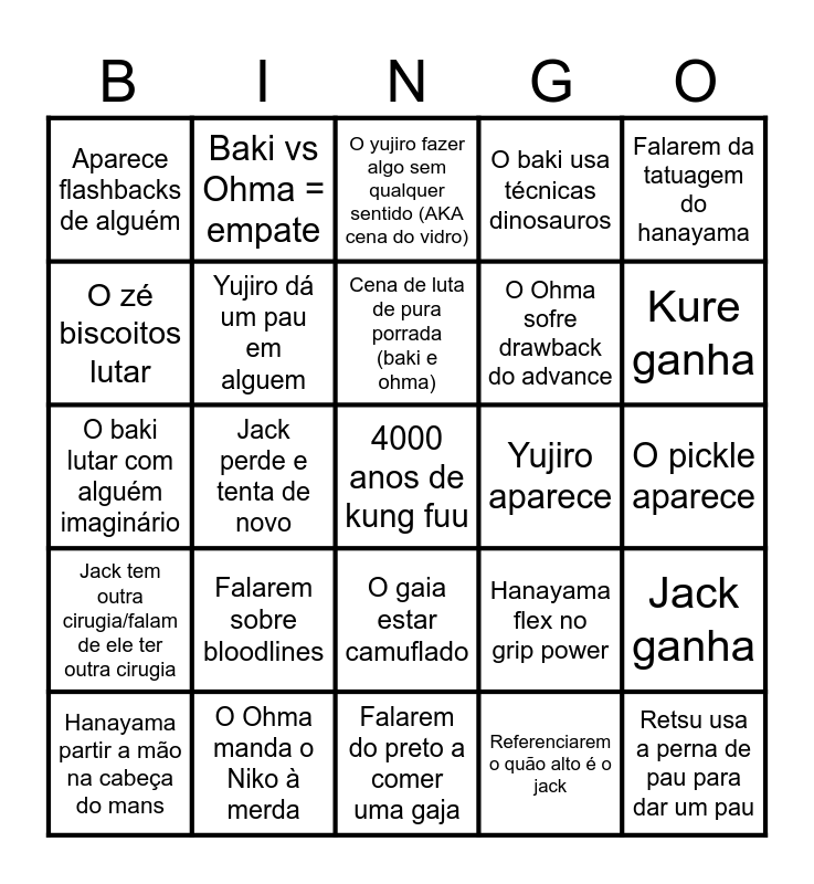 This bingo card has a free space and 24 words: Falarem sobre bloodlines, O Ohma manda o Niko à merda, Cena de luta de pura porrada (baki e ohma), Hanayama partir a mão na cabeça do mans, Falarem da tatuagem do hanayama, Aparece flashbacks de alguém, O zé biscoitos lutar, Baki vs Ohma = empate, Yujiro aparece, O gaia estar camuflado, O Ohma sofre drawback do advance, O baki lutar com alguém imaginário, Hanayama flex no grip power, Jack ganha, Yujiro dá um pau em alguem, Referenciarem o quão alto é o jack, O pickle aparece, O yujiro fazer algo sem qualquer sentido (AKA cena do vidro), Kure ganha, Jack perde e tenta de novo, Retsu usa a perna de pau para dar um pau, Jack tem outra cirugia/falam de ele ter outra cirugia, O baki usa técnicas dinosauros and Falarem do preto a comer uma gaja.