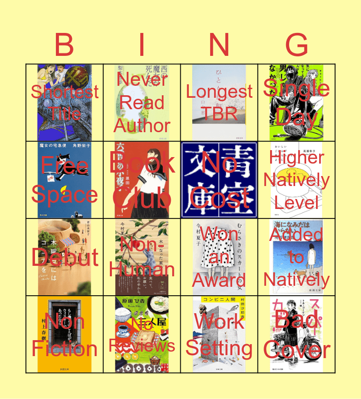 This bingo card has 16 images and 16 words: No Reviews, Added to Natively, Longest TBR, Shortest Title, Debut, Never Read Author, Won an Award, Work Setting, Free Space, Book Club, Non Fiction, Single Day, Non-Human, Higher Natively Level, No Cost and Bad Cover.