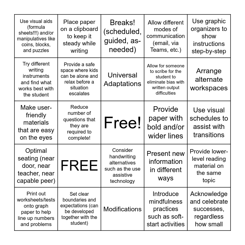 This bingo card has a free space and 25 words: FREE, Modifications, Universal Adaptations, Print out worksheets/tests onto graph paper to help line up numbers and problems, Use graphic organizers to show instructions step-by-step, Use visual aids (formula sheets!!!) and/or manipulatives like coins, blocks, and puzzles, Try different writing instruments and find what works best with the student, Place paper on a clipboard to keep it steady while writing, Provide paper with bold and/or wider lines, Consider handwriting alternatives such as the use assistive technology, Allow for someone to scribe for the student to eliminate bias with written output difficulties, Make user-friendly materials that are easy on the eyes, Present new information in different ways, Provide lower-level reading material on the same topic, Provide a safe space where kids can be alone and relax before a situation escalates, Comfortable lighting (Avoid fluorescent lighting), Use visual schedules to assist with transitions, Breaks! (scheduled, guided, as-needed), Arrange alternate workspaces, Reduce number of questions that they are required to complete!, Acknowledge and celebrate successes, regardless how small, Set clear boundaries and expectations (can be developed together with the student), Optimal seating (near door, near teacher, near capable peer), Allow different modes of communication (email, via Teams, etc.) and Introduce mindfulness practices such as soft-start activities.