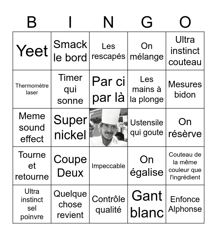 This bingo card has a free space and 24 words: Coupe Deux, Quelque chose revient, Par ci par là, Ultra instinct sel poinvre, Ultra instinct couteau, Yeet, Thermomètre laser, Smack le bord, Ustensile qui goute, Impeccable, Les mains à la plonge, Meme sound effect, On égalise, Couteau de la même couleur que l'ingrédient, Timer qui sonne, Gant blanc, On résèrve, Les rescapés, Mesures bidon, Super nickel, Enfonce Alphonse, Tourne et retourne, On mélange and Contrôle qualité.